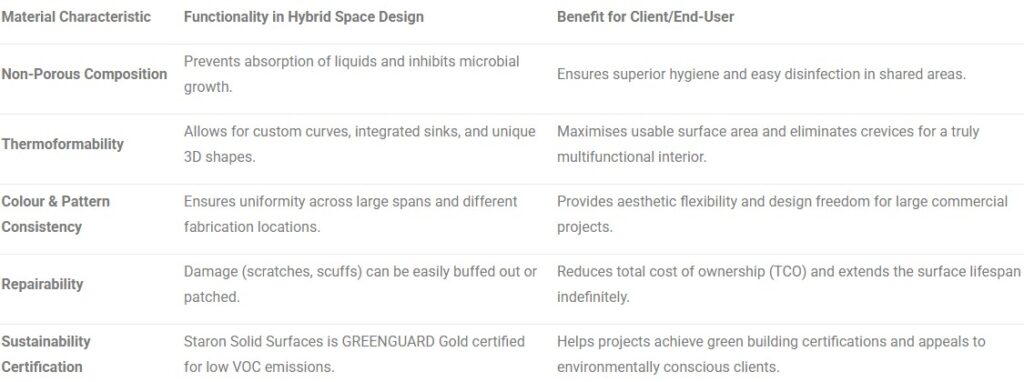 When evaluating surfaces for intensive, mixed-use areas, materials like Staron Solid Surfaces stand out as a highly reliable option. These materials are engineered specifically to meet the demanding nature of hybrid environments.